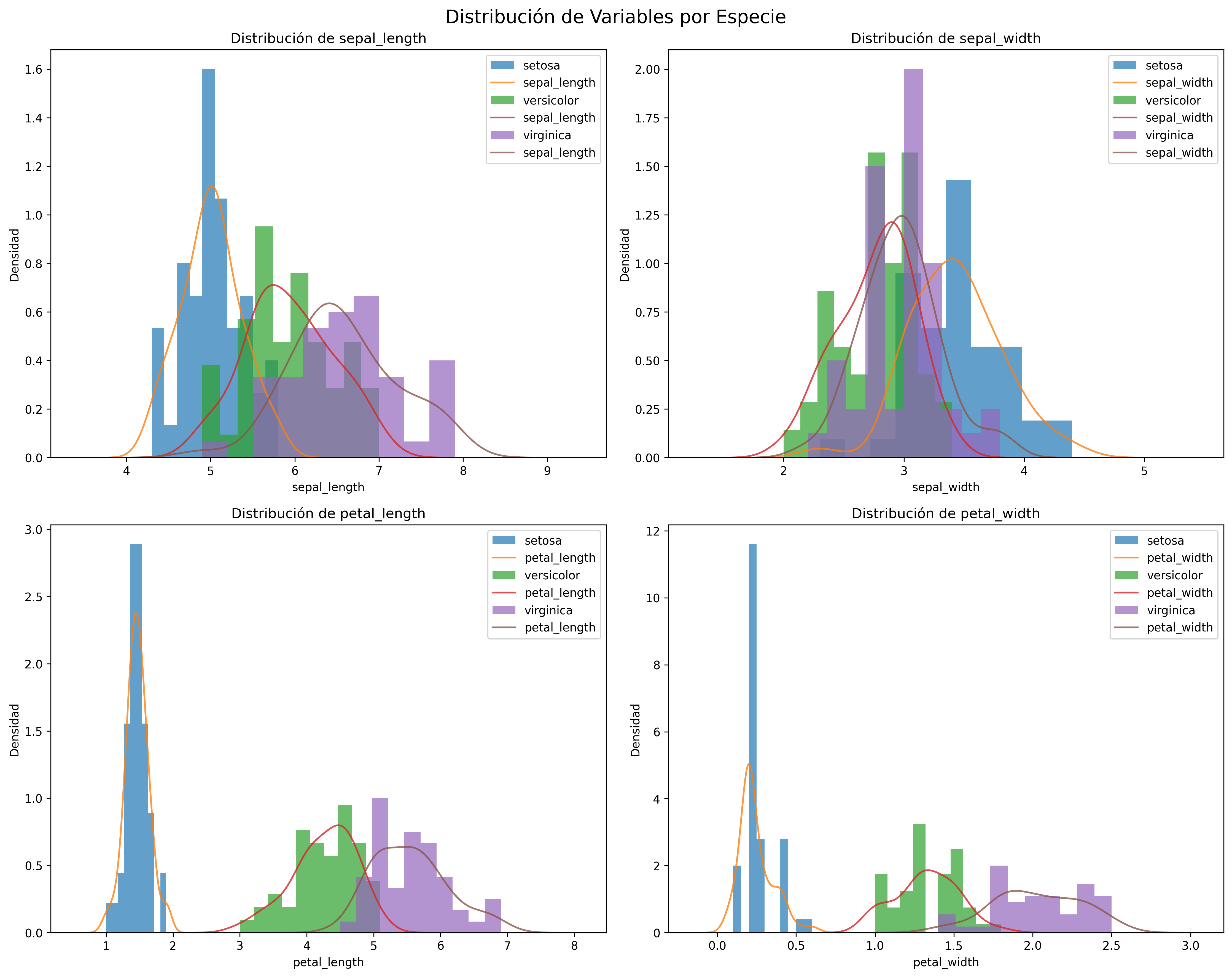 Esto sugiere que las variables de pétalos son las más útiles para tareas de clasificación. - En los sépalos, las distribuciones se superponen más, por lo que aportan menor poder discriminante.