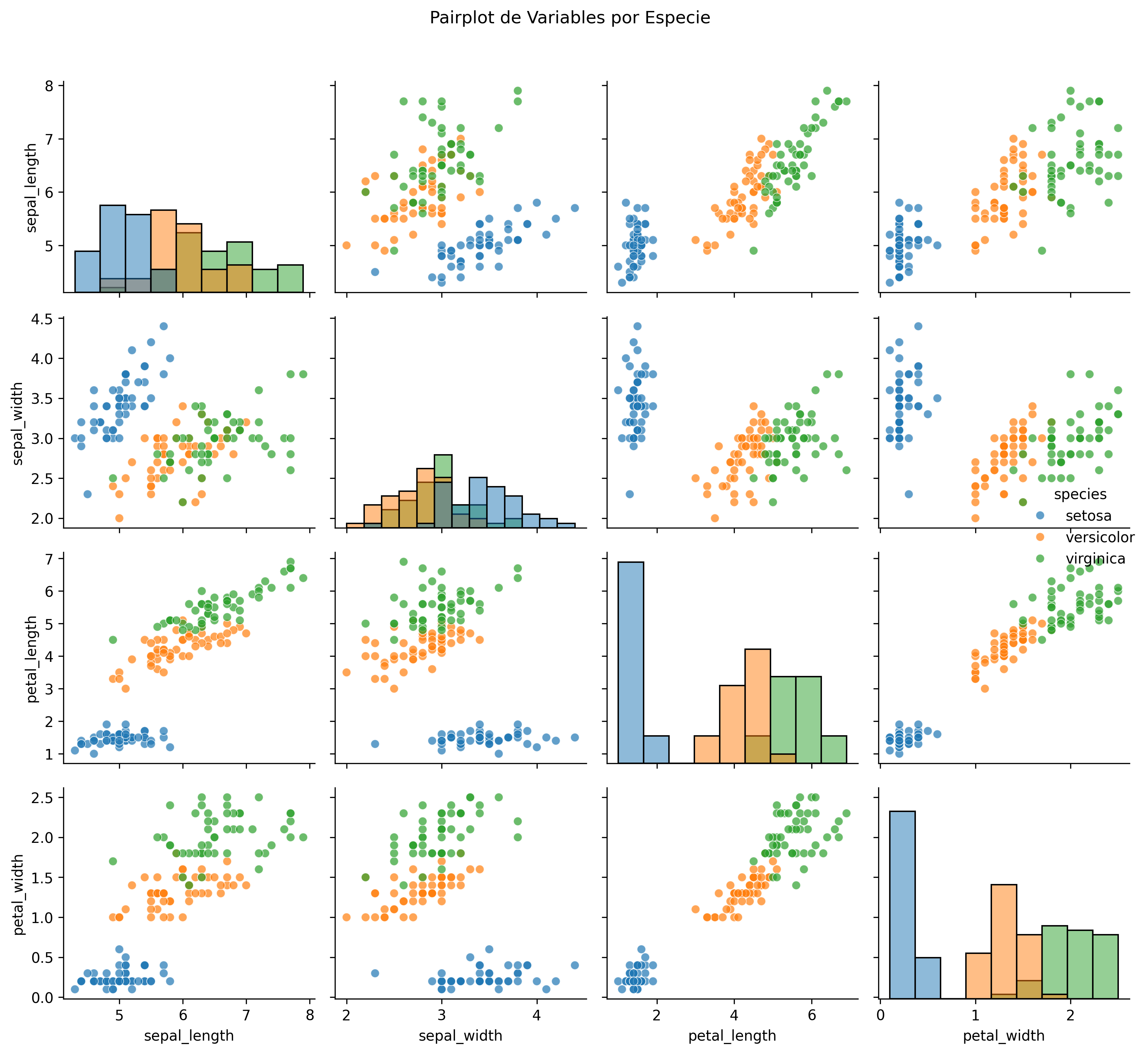 .describe(),.corr()y medidas de asimetría y curtosis. - Exploración visual → generación de gráficos comparativos para examinar la separación entre especies y sus correlaciones.