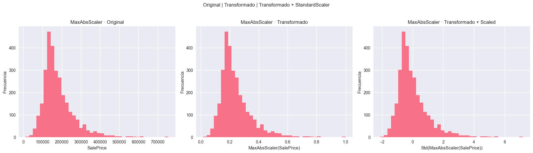 Figura 6: Transformación logarítmica segura (log1p) aplicada a SalePrice. Panel izquierdo: Distribución original con cola derecha pronunciada y skewness=4.68. Panel central: Después de aplicar log(x+1), la distribución se comprime significativamente - los valores grandes se acercan a los medianos en escala logarítmica, reduciendo skewness a ~0.18 (-96.2%). Panel derecho: Versión final con StandardScaler sobre log-transform, resultando en distribución aproximadamente normal. Esta transformación preserva el orden relativo de valores (a diferencia de QuantileTransformer) y es invertible con expm1.