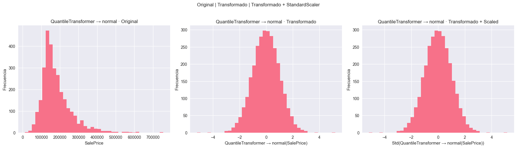Figura 5: Efecto de QuantileTransformer con output_distribution='normal' en SalePrice. Panel izquierdo: Distribución original asimétrica con skewness=4.68. Panel central: Después de QuantileTransformer, los datos son mapeados a una distribución normal casi perfecta mediante transformación de cuantiles - cada valor se mapea a su percentil correspondiente en una gaussiana. Panel derecho: Versión escalada final. Nota importante: Aunque visualmente es una campana perfecta (skewness≈0), esta transformación "fuerza" la normalidad perdiendo información sobre distancias relativas originales entre valores.