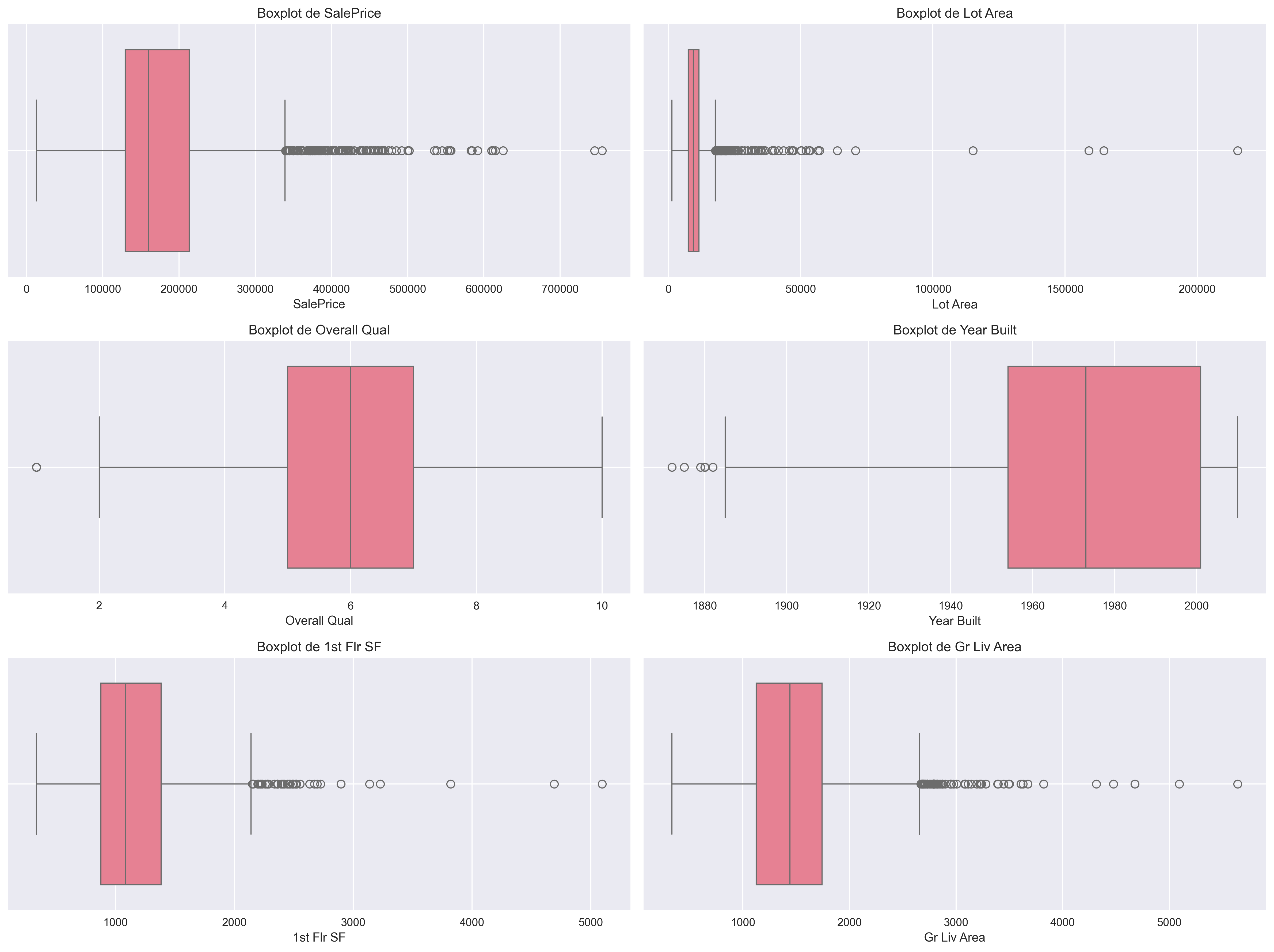 Figura 2: Boxplots comparativos de 6 variables clave mostrando la magnitud del problema de escalas. Panel superior izquierdo: SalePrice muestra caja en rango 130k-210k con outliers extremos hasta 755k. Panel superior derecho: Lot Area con caja comprimida cerca de 0 y outliers masivos extendiéndose hasta 200k+. Panel medio izquierdo: Overall Qual con distribución discreta de 1-10, relativamente balanceada. Panel medio derecho: Year Built muestra distribución uniforme 1900-2010 con pocos outliers históricos. Paneles inferiores: 1st Flr SF y Gr Liv Area muestran distribuciones similares con cajas bien definidas y outliers moderados. La visualización evidencia la necesidad crítica de scaling para KNN/SVM.