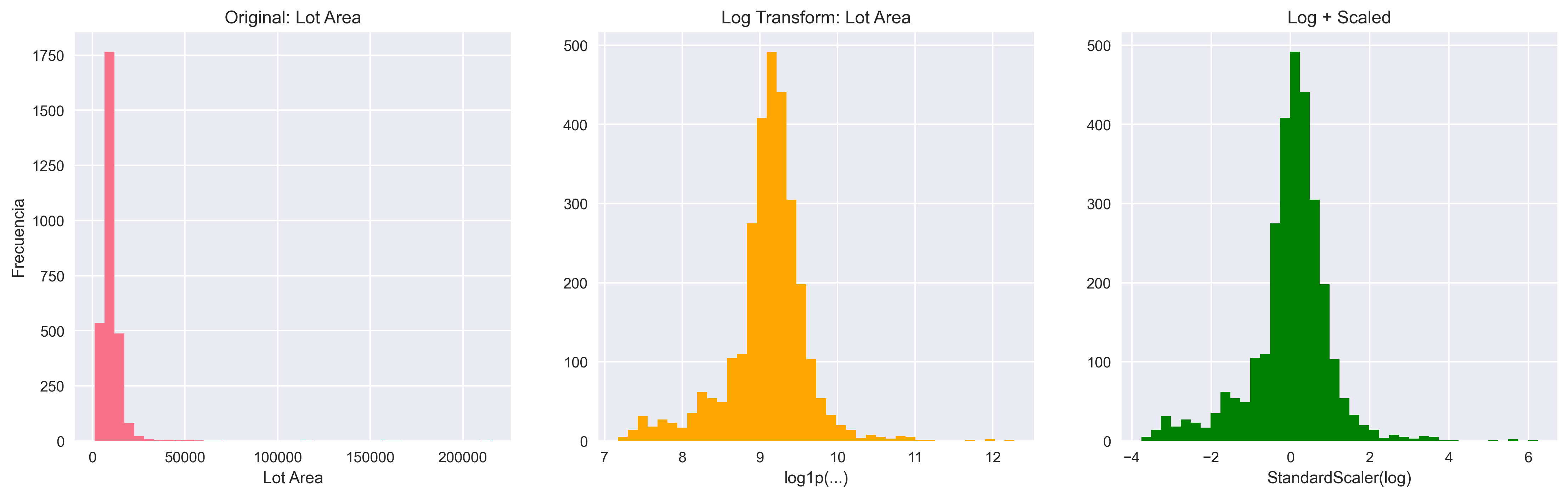 Figura 7: Comparación detallada de transformación logarítmica en Lot Area (variable más sesgada del dataset con skewness=12.82). Panel izquierdo: Distribución original mostrando pico masivo cerca de 0 (lotes pequeños) y cola extremadamente larga hasta 215k sq ft. Panel central: Después de log1p transform, la distribución se "suaviza" dramáticamente - el pico se expande y la cola se comprime, reduciendo skewness a 0.76 (-94.1%). Panel derecho: Log transform + StandardScaler resulta en distribución casi normal centrada en 0. El eje X muestra log1p(sqft) en el centro y StandardScaler(log) a la derecha, evidenciando la normalización exitosa.