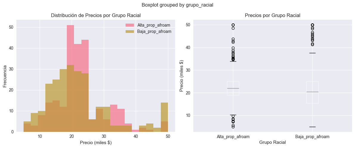 Figura 1: Análisis de sesgo racial en Boston Housing Dataset. Panel izquierdo: Histograma superpuesto mostrando distribución de precios (MEDV) por grupo racial. En rosa (Alta_prop_afroam) se observa distribución concentrada en rangos bajos (\(10k-\)25k) con cola corta. En marrón (Baja_prop_afroam) distribución más amplia (\(15k-\)50k) con media significativamente mayor. Panel derecho: Boxplot comparativo confirmando la brecha - el grupo Baja_prop_afroam tiene mediana ~\(25k vs Alta_prop_afroam con mediana ~\)18k. Los outliers (círculos negros) son más frecuentes y altos en el grupo de baja proporción afroamericana, evidenciando sesgo sistemático en valuaciones históricas.